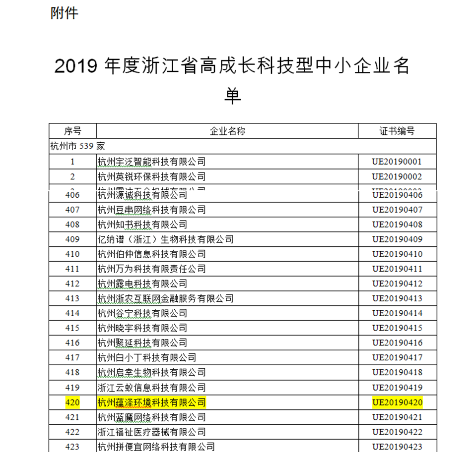 根據(jù)省科技廳印發(fā)的《浙江省高成長科技型中小企業(yè)評價指導(dǎo)性意見》(浙科發(fā)高〔2016〕87號)和《關(guān)于組織開展2019年度高成長科技型中小企業(yè)評價的通知》(浙科發(fā)高〔2019〕46號)有關(guān)規(guī)定,經(jīng)科技管理部門組織評價、研究決定,評選結(jié)果客觀、真實,如實反映了企業(yè)的綜合實力。“杭州蘊澤環(huán)境科技有限公司”認定為2019年度浙江省高成長科技型中小企業(yè)。